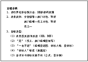 通过向系统管理员获取HR在电子化考核系统中的密码权限,我在分析各类考核表单的流向基础上,总结出电源公司电子化绩效考核时常见差错类型: