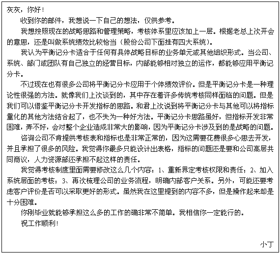 在这封信里,丁博士支持增加系统绩效的观点和应用平衡记分卡的理由。同时她给我指出了平衡记分卡的困难之处和推进的一个建议:由于平衡记分卡涉及战略,应与高层共同制定。