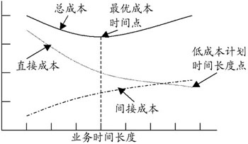 系统总时间与成本的关系如图1所示。其中间接成本代表管理成本,例如监督、管理、咨询和利息。它和任何特定工作包或作业无关。只是与时间正相关。直接成本一般包括劳动力成本、原材料成本、设备成本、租线成本、物业成本、有时还有转包成本。由于直接成本的产生是基于正常的方法和时间,流程时间越被压缩,完成流程的直接成本越高。所有工作包或业务的成本总和表示业务的总直接成本。由图1可见,系统总时间的最佳点在业务总成本的最低点处。只有在这个点,既是总成本最低,又能保证流程有效地被完成。目前,很多电信企业运营流程的时间远远大于最佳时间。关键是如何缩短系统总时间,从而减小各项业务的直接成本。对电信这类服务业来说,寻找这个系统总时间的最佳点,可以通过对流通效率的统计测算进行,具体方法如下: