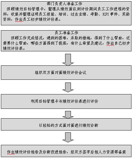 运用绩效评价表格对原定绩效目标达成情况逐项对照评价(主管与员工双方评价),待完成后,主管与员工双方共同找出影响绩效达成的原因、存在的问题,解决的方法,并形成书面材料为A阶段提供依据。