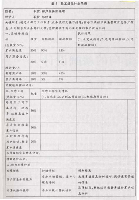 以上简要分析说明了绩效计划所包含的三方面内容的含义和具体操作实施的方法,作为紧密联系的一个有机组成。以下举例说明如何制订一套完整的绩效计划,如表1。