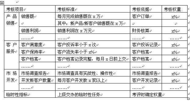 2考核指标要明确细化,不仅有结果指标,还要有反映过程的指标。象上述案例中三人的业绩考核目标,除了销售、服务和开发大类指标外,还对大类指标进行分解,增添如新产品/新市场销售额、客户保持率、销售利润、市场调查报告等细化指标。通过指标考察,还能发现许多销售中的潜在问题。如销售金额通过客户定单来反映,如果销售人员的定单数目多但是平均金额少,说明他把大量的时间用于访问小顾客、赢利性差的客户上,他的销售和服务技巧不到家,人员销售利润的高低则反映了其销售效率的高低。通过各个指标相互验证,就有效克服了惟业绩独尊状况,人员的真实水平就能得到全面验证。