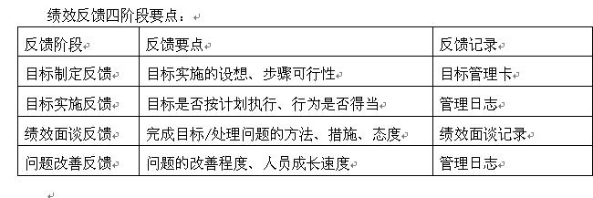 绩效反馈中,主管的作用至关重要,这就需要主管改变角色,从监督者、甩手掌柜过渡到员工的教练、辅导者,帮助下属真正成长。为了保证绩效反馈的有效进行,可以提前对主管进行相关知识培训,也可以把此内容作为主管的一个考核指标,通过对与员工访谈纪录、问题改善纪录的检查、人员满意度调查等,对主管称职能力也就有了一个清晰认识。