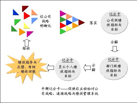 平衡记分卡的实施可以有效地促使你的公司实现战略的显式化管理。它要求将你公司的战略与绩效管理相连接,因此它会促使你主动对自身的使命、价值观与愿景进行检讨,设定战略目标,这样就首先促使你将战略明晰;在你明晰了你公司的战略后,平衡记分卡将会与你公司的绩效管理各个环节紧密相联。平衡记分卡首先是将你公司的使命、价值观与愿景、战略转化为绩效指标并分解到你公司的每一个员工,同时它还会促使你将实现指标的行动计划与指标联系起来并配置资源,确保计划、指标与战略目标的实现;同时平衡记分卡也是进行绩效指导与反馈的重要工具,它能持续地对你公司各个层面的绩效实施监控、实现沟通,以确保整体业绩达成,促进你的战略目标实现;最后平衡记分卡还是考核评价的工具,它与薪酬等人力资源政策有效地结合能够实现合理地绩效回报,以激励你公司全体员工,提高他们实现其绩效目标的积极性与主动性。