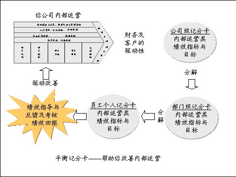 平衡记分卡帮助你改善内部运营,还体现在它是一个有效的绩效管理工具。平衡记分卡要求你主动根据内部运营设置考核指标。你可以选择那些能直接驱动战略目标的内部运营主要方面作为绩效管理监控点;你还可以通过指标的分解,将这些内部运作关键控制点的责任落实到与其相关的部门与员工;你还可以通过日常的指导与反馈、考核来引导你公司各个部门与员工行为,确保他们自觉地按照事先制定好的运营规则做事。由此可见,通过平衡记分卡的实践,能够驱动你及你公司的员工自觉地去实现你公司的内部运营改善的目标,确保内部运营管理的变革落到实处。