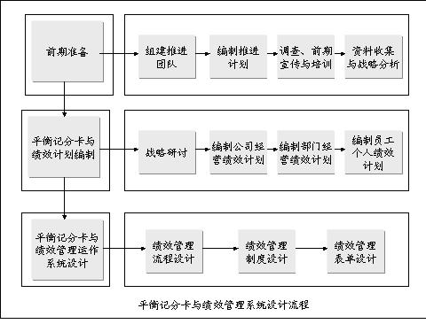 平衡记分卡与绩效管理系统可分为三个设计步骤:首先在绩效计划设计之前,你要做好平衡记分卡与绩效管理系统设计的前期准备工作,它主要包括推进团队的组建、编制推进计划、内部调查、前期宣传与资料收集等内容。