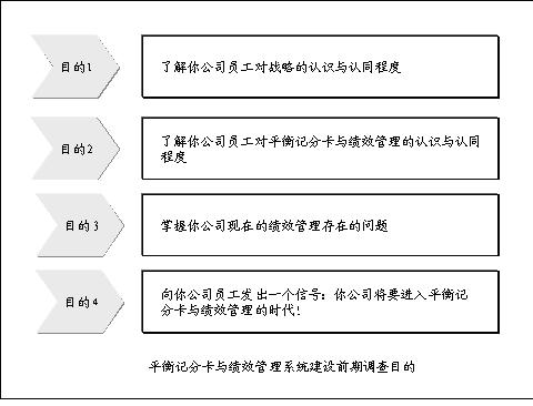 在正式开始平衡记分卡与绩效管理系统建设之前,我们建议你最好和你推进小组在你公司内部组织一次大面积的前期调查活动,它能够为你们在后期的宣传与方案的设计提供很好的帮助,组织这次调查活动主要是为了澄清以下四个方面的问题: