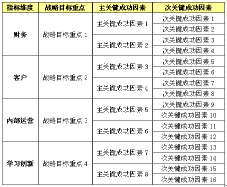 这样每个战略目标重点都形成了一个逻辑型的因果关系链的鱼刺图。接下来,将从战略目标分解下来的关键成功因素整理为表格,如图4所示。