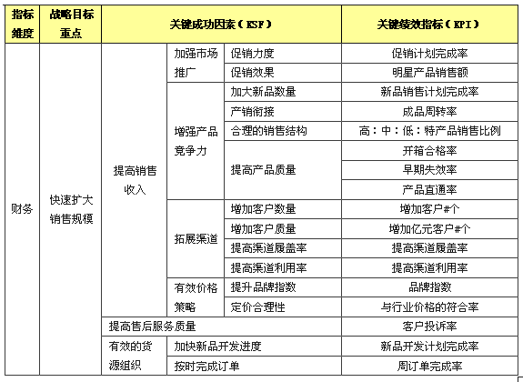 前面,我们已经将从战略目标分解下来的关键成功因素,从关键成功因素依次提取出关键的衡量指标,即关键绩效指标(KPI),如图5所示。