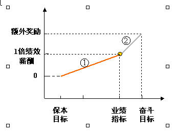 传统方法在制定高管年度业绩指标时,通常会设定保本目标,基本目标和奋斗目标三项,保本目标决定高管能否获得绩效薪酬,基本目标决定高管可得绩效薪酬的比例,奋斗目标决定高管可得的额外奖励。由于多种原因,保本目标和奋斗目标在大多数企业其实形同虚设,比如完不成保本目标的高管,可能早就辞职或下台;完成业绩指标的高管在企业中非常少,能完成奋斗目标的企业高管更是凤毛麟角,不说也罢。这里只考虑通常情况下,高管所得年度绩效薪酬的状况(即保本目标与奋斗目标之间的区间),如下图: