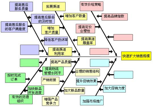 为了加深对关键业绩指标的理解,我们利用鱼骨图战略分解法提取关键业绩指标,以下是以“快速扩大销售规模”这个战略目标重点进行分解的实例,如图1所示。