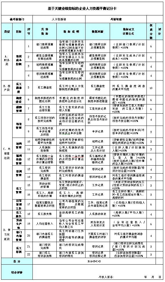 以下是基于关键业绩指标设计的企业人力资源平衡计分卡,有实用参考价值。