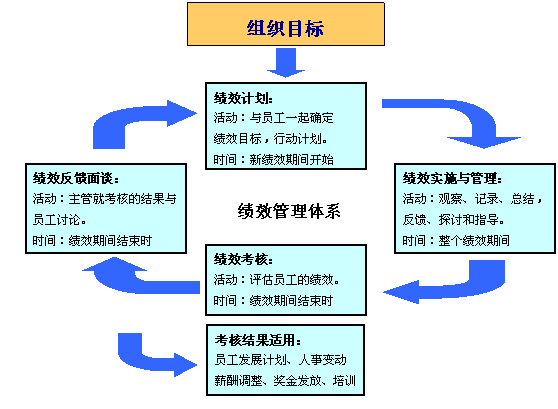 绩效管理是一个员工与管理者双向沟通的动态过程。一个完整的绩效管理体系包含设定绩效目标、记录员工的期间绩效表现并为员工绩效目标的完成适时提供合理的资源支持与业务指导、期终绩效考评与反馈沟通、绩效考核结果的合理运用等内容。简单表述为:绩效计划、绩效实施与管理、绩效考核、绩效反馈面谈四个部分(如下图所示)。