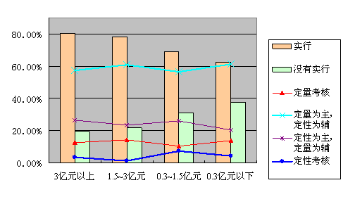 很有趣的是,我们在图3中看到了一个带有趋势性的现象:实行绩效考核的企业比例依照资产规模的增大呈递增趋势,0.3亿元以下企业实行绩效考核的比例最低,约60%强,3亿元以上企业实行绩效考核的比例最高,超过80%;资产规模越大,实行绩效考核的比例越高(见图3)。在实行了绩效考核的企业样本总体中,不同资产规模企业间在选用的绩效考核形式比例上与总体水平相似(见图3中的折线部分)。
