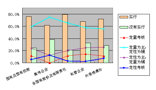 从图2的柱形图部分可以看出,非国有股份及有限责任公司实行绩效考核的比例最高,约80%;其次是国有及国有控股企业,超过75%;集体企业中实行绩效考核的比例为最低。