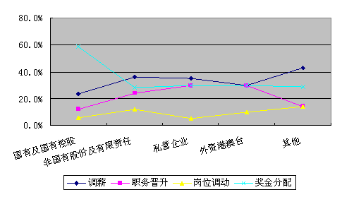 从企业性质来看,国有及国有控股企业考核结果应用于“奖金分配”的相对比重远远高于其他性质企业,近60%,用于“调薪”、“职务晋升”方面的相对比重最低,其他性质企业间差别不大。