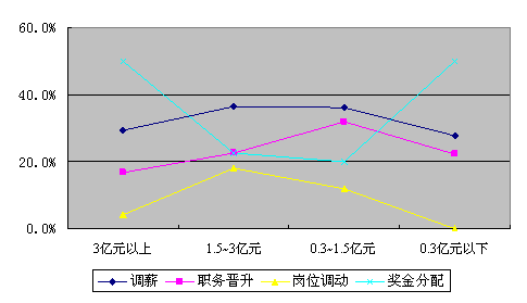 从企业资产规模来看,0.3亿元以下的企业、3亿元以上的企业考核结果用于“奖金分配”的相对比重最高,各占约50%;0.3~1.5亿元企业用于“职务晋升”的相对比重最高,为18.2%;1.5~3亿元企业用于“岗位调整”的相对比重最高,为18.2%。
