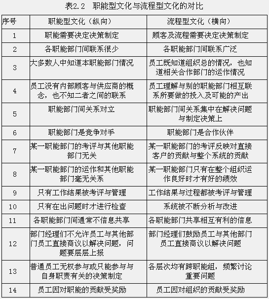 再者,绩效管理要与本公司的企业文化相适应。企业文化是在企业长期运作中逐渐形成的群体意识,以及由此产生的群体行为规范。每个组织都有它独特的文化,这种文化往往通过组织运作形式和大多数员工的行为体现出来。一般而言,企业中同时存在两种意义的组织文化。一种为职能文化,也称纵向文化;另一种为流程型文化,也叫横向文化。二者之间的比较参见上表2.2。