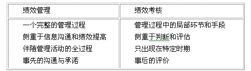 绩效考核只是完整绩效管理过程中的一个环节。绩效管理与绩效考评的主要区别如下表: