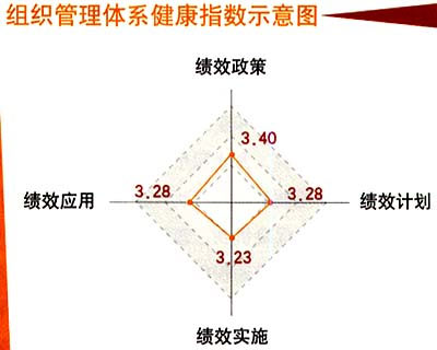 从此雷达分析图我们可以看出,绩效管理体系的四个指标中,绩效实施健康指标明显最低,为3.23;其次为绩效计划健康指标和绩效应用健康指标,为3.28;得分最高的为绩效政策健康指标,为3.40。