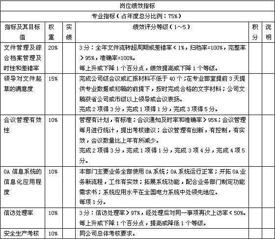 指本岗位的关键业务指标,如在办公室主任的绩效合同中把文件管理及时性和差错率、领导对文件起草的满意度、保密和印章管理出错率、综合档案管理完整性及准确率、信访处理率等8个指标作为考核的主要业务标准,全部实行量化。同时,办公室内部各岗位绩效管理指标,是按照岗位要求,对其中的一些指标进行细化和量化,再增加相应的二级目标。如秘书岗位的文件审核正确率、接待岗位的预算使用准确率、文书岗位的会议通知的及时率和会议组织及数量控制率等等。