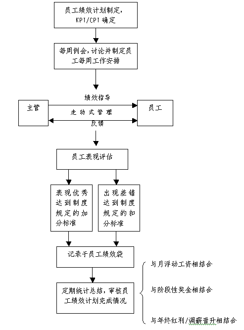 3、 分值与员工实际利益的挂钩。绩效评估的结果如果不与员工的可得利益相联系,员工一般不会重视并积极投入到绩效评估的过程中。笔者建议,可分阶段采用以下三种方法:A.与月浮动工资相结合。浮动工资也可称之为绩效工资,一般我们可以提取员工工资的5%-15%作为浮动工资(同时规定最低、最高浮动工资值)。例如,当月员工扣1-2分的,扣发5%的月工资;3-5分的,扣发10%的月工资并处书面警告一次(一年内被处三次警告的,年终无奖金,当年不予调薪及提升);5分以上的,扣发15%的月工资并记大过一次,一年内被处两次大过的予以开除(被记大过者同样年终无奖金,当年不予调薪及提升)。相应的,当月员工加1-2分的,多发放5%的月工资;3-5分的,多发放10%的月工资;5分以上的,多发放15%的月工资,并可根据员工的表现,酬情撤销员工先前的警告、大过记录;B.与阶段性奖金相结合。有些公司每季度或每半年会根据公司的盈利情况,发放一次奖金。奖金发放情况一般是与员工的绩效计划的执行情况相结合的,在此,我们可以结合其该阶段的加扣分情况,对其所得奖金金额作一些调整。例如,第二季度甲员工顺利完成其绩效计划或承诺,应得奖金3万元,不过根据其绩效记录,第二季度甲员工因为迟到被扣3分,积极投稿加1分,无理由未准时参加公司安排的培训被扣2分,第二季度总共被扣分数为4分。根据公司阶段性奖金发放的规定,该季度无扣分情况的奖金发放100%,扣分在1-2分的奖金发放9%,3-5分的奖金发放80%,6-8分的奖金发放70%,9分以上的奖金发放40%,因此,甲员工第二季度实得奖金最终为3x80%=2.4万元;C.与年终分红、晋升/调薪相结合(具体可参照方法B.的思路根据公司的实际情况制定)。