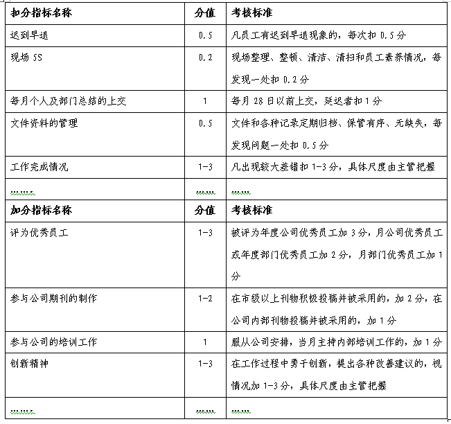 1、 制定奖励加分及惩罚扣分的标准。一般较正规的企业,都有自己的绩效指标词典,这是制定奖励加分及惩罚扣分标准的基础。由于每位员工均有自己的绩效计划,因此奖励加分及惩罚扣分的标准更侧重于CPI(共同绩效指标),举例如下表: