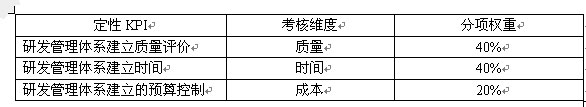 例如:某公司的研发部经理某个考核期内的一项重要工作就是建立公司的研发管理体系。那么对这项工作的考核很显然只能是定性考核。运用上面的方法,经过考核双方的讨论,决定从3个最重要的方面来考察这个定性指标的完成情况,如下表所示: