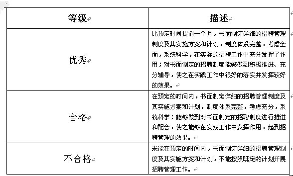 例如人力资源部要制定招聘制度这样一个阶段性,任务性的定性KPI,按照“优秀”、“合格”和“不合格”划分了三个等级,具体等级描述如下表。