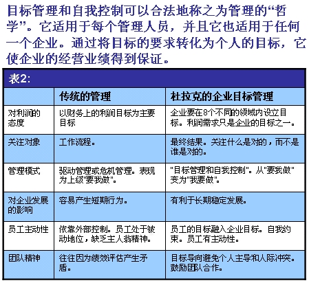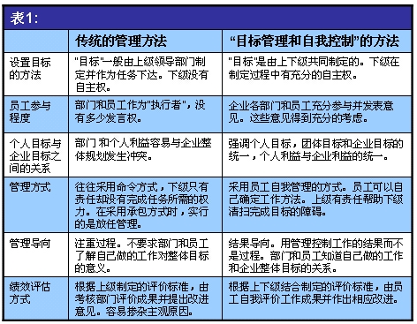 从企业的层面上看,采用“目标管理和自我控制”的方法与传统的管理甚至有着更大意义上的区别(见表2)。