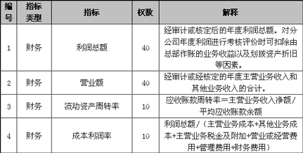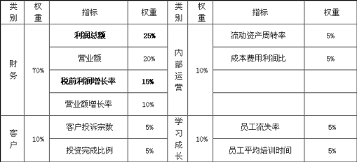 例一,对于小规模低收益型分子公司,根据集团对其现阶段的战略定位,可以使用利润导向为主的经营业绩考核,可以考虑采用以下考核指标和权重: