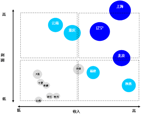 通过分析收入利润矩阵,可以对目前A集团下属分子公司进行较为清晰的判断,并将其分为四类:大规模高效益型、小规模高效益型、小规模低效益型、大规模低效益型。对于这四种类型的公司,如果采取不同的导向性考核,在指标设置和权重设置上会有区别。