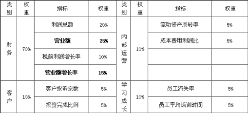 我们的方案当中业绩考核指标当中添加了客户、内部运营、员工学习与成长3大类指标。并且在财务指标当中添加了营业额增长率和税前利润增长率两个成长性指标,其导向性含义是鼓励成长。对于规模较小,资源不足的公司鼓励其盲目扩大规模是不恰当的,可以采用利润导向的激励导向,因此在权重设置方面可以有所偏重。