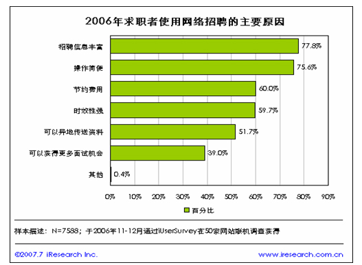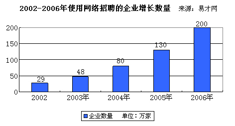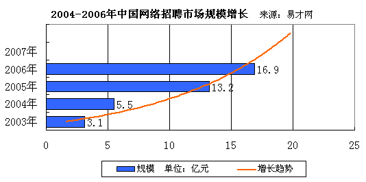 据最新统计,在个人与企业的招聘求职活动中,已有70%左右的企业选择网络招聘作为招聘的第一渠道,而超过90%的求职者都听说或使用过网络招聘。据iResearch调查中心研究,中国网络招聘的市场规模2006年达到16.9亿元,平均增长率为73.9%.