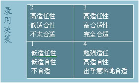 田:一般情况下,在最终决策时不会只对一个人进行是否录用的决定,最好是有2~3名候选人,根据本企业人事经理要面对的主要问题和一般人事经理的胜任力特征进行决策。以下是一个关于人事决策的方格图: