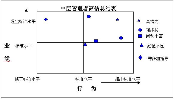 中层管理者评估总结表可以使我们清楚地看到,哪些中层管理者拥有较高的潜力,哪些中层管理者应当得到继续提拔。那些既拥有较高潜力又应当得到继续提拔的中层管理者被放在右上栏,在这一栏的中层管理者无疑将被纳入培养体系中。