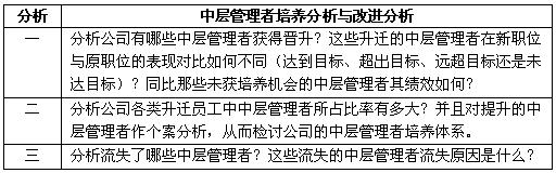 在进行评估分析时,HR可以从升迁和新职位评估结果、中层管理者流失率和流失原因等方面入手。见下表。