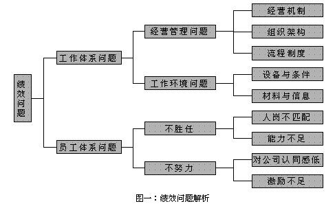 从图一我们可以看到影响企业绩效的因素可以分为工作体系问题和员工体系问题两大方面。工作体系包括经营管理机制问题和工作环境问题,这些因素相当于是绩效的硬件系统,工作体系问题对绩效的影响也较大,但是这些是相对稳定的,也是相对较容易进行调整的。而企业绩效问题的难点还是在于员工体系方面的问题,这些因素相当于绩效的软件系统,不管是员工不胜任还是员工不努力,都是与每个员工个体相关,随时都会存在于企业的每一个角落,如果没有良好的管理机制,这些低绩效的员工就会成为影响企业绩效的酵母迅速扩散。而且,从根本上来讲,企业的工作体系也是受员工体系所影响的,不管是经营机制、组织机构和流程制度,还是设备条件、材料信息,都与相关的员工有非常密切的关系,一个不称职的车间人员,设备也会经常处于不良状态,一个不称职的管理人员,很难设计出良好的经营管理系统。