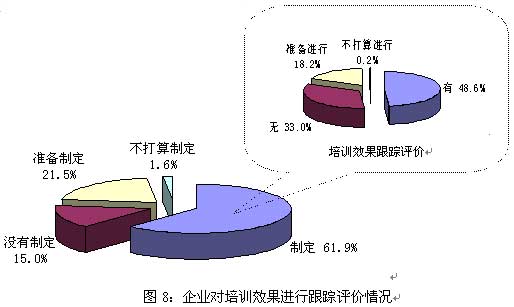 而根据本届调查数据显示,能够进行培训效果跟踪评价的企业仍不可称为广泛。如图8所示,在制定了员工培训计划的企业样本总体中,不到50%的企业能够对培训效果进行跟踪和评价,没有进行跟踪评价的达1/3。