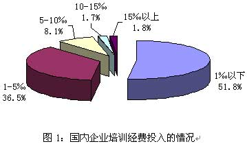 根据第二届中国企业人力资源管理现状调查数据显示(见图1),培训经费占企业销售收入1‰以下的企业有51.8%,占销售收入1-5‰的企业有36.5%,占销售收入5‰以上的企业有11.6%。