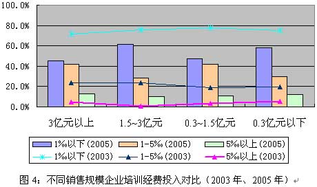 如果2003年第一届调查和2005年第二届调查的总体对比不能充分说明问题的话,通过对比不同销售规模企业的培训经费投入比例,进一步分析,我们会得出同样的结论: