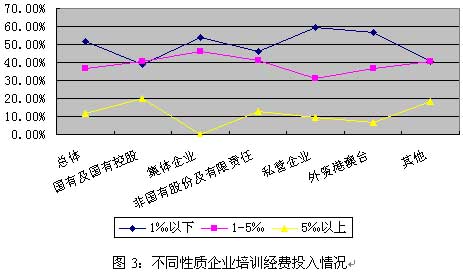 其实再仔细看看图3,我们会发现一个问题:以具有良好培训机会倍受人青睐的外企的培训经费投入比例并非特别突出,甚至相对总体水平还略低,而国有企业在1‰以下培训投入的企业比例方面远远低于外企,而在5‰以上高培训投入的企业比例方面则又远远高于外企,如此看来国企似乎更重视培训。也许有人提出挑战:培训经费占销售收入比例高不一定培训经费总额高,与销售额有关系;再者,外企培训机制已经成熟,很多培训设施已经固定了。其实这两个问题都在说培训经费的流向问题。我们知道,国企的培训设施也相当不错,丝毫不比外企逊色;另外无论培训总额高低,又是否用在了刀刃上?