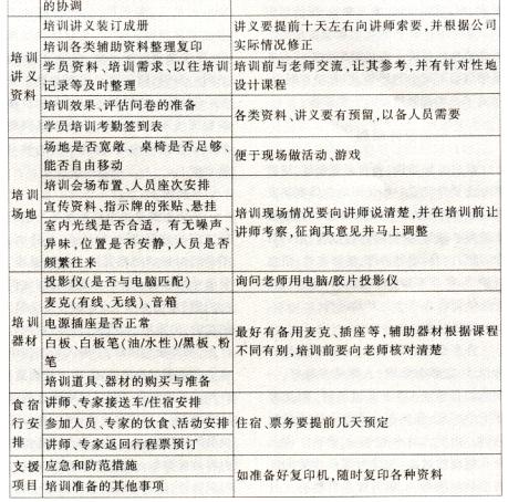 在培训过程中,现场的各种后勤安排也必不可少,如培训教材的复印、发放,培训器材的调换准备,人员饮食服务,培训纪律的强调,卫生打扫,现场紧急情处理等,这些都需要安排具体人员来解决。