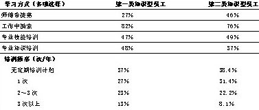 本次调研调查了知识型员工在企业中学习业务知识的主要方式,结果表明,知识型员工的主要学习方式包括师傅带徒弟、工作中摸索、专业技能培训和专业知识培训4种形式,后三种方式我们认为是企业“有意识的培养方式”。从表2我们发现,有意识地培养和开发两类知识型员工的企业不到50%,82%的第一类知识型员工和76%的第二类知识型员工仍然是采用工作中自己摸索的方式学习工作中的技术;另外,根据对两类知识型员工培训频率的调查结果发现,目前企业对于知识型员工培训的投入仍然较少,对于两类知识型员工培训频率在每年3次以上的分别只有13%和8.1%,而无定期培训计划的企业分别占到了37%和38.4%,培训方式也主要是集中在岗前培训,也就是说培训的目的仅仅是为了让知识型员工的知识储备满足目前操作的要求,缺乏持续学习的机制。
