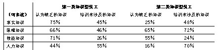 表3对比了知识型员工认为缺乏的知识和企业培训中却恰恰又没有涉及到的知识。从数据结果中发现两个问题: