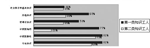 (1)第一类知识型员工的知识结构显然比第二类知识型员工的知识结构更加全面,在知识结构的每一个维度,而且掌握该维度知识的第一类知识型员工的比例都比第二类知识型员工要大,这说明劳动力市场对于两类知识型员工的素质要求是有差异的,由于工作内容不同(第一类知识型员工在知识面、思维能力和创新能力方面要求更高)对于第一类知识型员工的要求也更高。