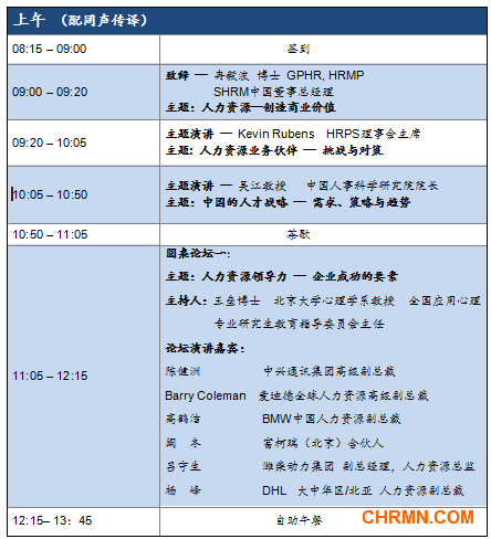 SHRM高层将亲临现场。SHRM附属机构HRPS(原人力资源规划协会)理事会主席凯文•鲁宾斯先生、SHRM China首席运营官兼董事总经理冉毅波博士、SHRM全球业务发展总监罗伯特•加西亚先生将出席此次峰会,为中国人力资源管理者带来最前沿的全球人力资源发展趋势报告。中国人事科学研究院院长吴江教授、北京大学教授、全国应用心理专业研究生教育指导委员会主任王垒博士等海内外知名人力资源管理领袖以及来自世界五百强企业的人力资源高层领导者将一道与参会嘉宾分享最新人力资源管理理念和成功实践经验。