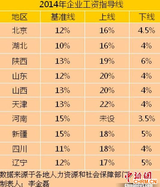 据中新网记者不完全统计,截至6月17日,全国共有北京、天津、湖北、山东、山西、陕西、河南、新疆、四川、辽宁等共10个省(区、市)发布了2014年的企业工资指导线。在这14个地区中,河南和新疆的基准线最高,均为15%;湖北的基准线最低,为10%。
