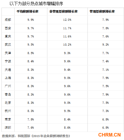 二三线城市预期2015年薪酬涨幅为9.0%,高于一线城市。非管理层涨幅为10.3%,同样高于一线城市非管理层。二三线城市中最抢眼的是成都9.9%、西安9.7%、重庆9.7%、武汉9.5%、一线城市中北京、上海、广州起头并进8.3%。