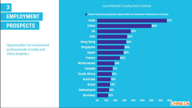 - 根据CFA 协会2015年全球市场气氛调查,中国的CFA会员对当地金融业就业市场十分之乐观,达60%受访者认为2015年的市场状况会好转,行业的就业机会更多,比例较2014年48%有所提升,反映他们对就业前景颇有信心
